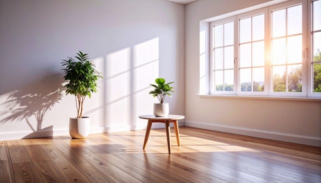 朝の光が差し込むリビング、