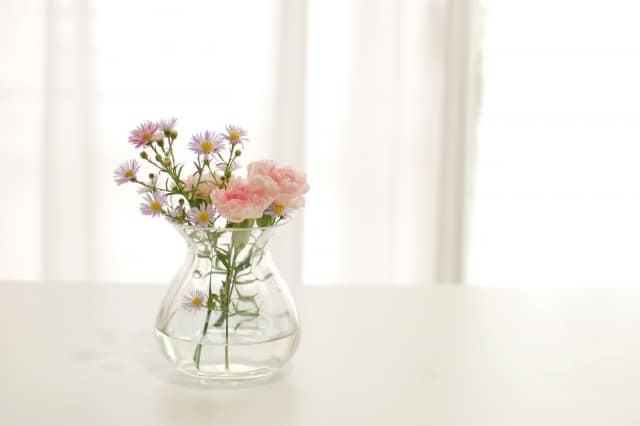 季節の花を一輪飾るガラス瓶。